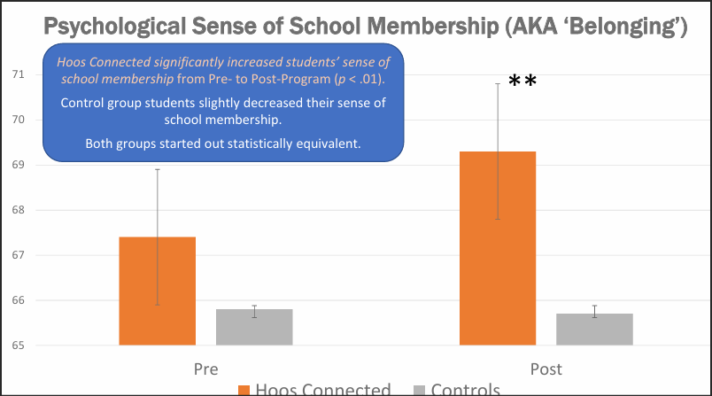 Hoos Connected participants showed a significant increase in their sense of “school membership,” or belonging, Allen found, while the control group actually declined slightly.