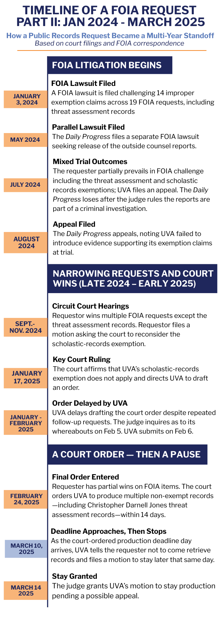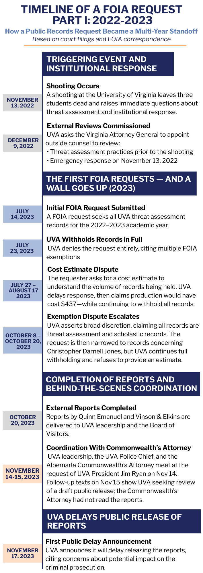 One of the greatest tragedies in the history of the University of Virginia occurred on November 13, 2022 when three UVA student athletes were brutally and senselessly murdered by another student. The facts and the truth surrounding the University's investigation and actions regarding the perpetrator PRIOR to the murders has never been disclosed to the public. The Ryan administration did everything in its power time and again to withhold all relevant information from the University community. Now, over two years later, a party who has assiduously attempted to reveal the facts and truth through Freedom of Information Act (FOIA) requests has a final court order demanding that the relevant actions of the UVA Threat Assessment Team be disclosed--however UVA continues to take evasive action by promising to produce documents and failing to do so. The time is long overdue for the University community, particularly the loved ones of the slain students, to learn who knew what and when, and what actions were and were not taken.