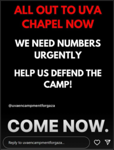 Another ominous sign was a post appearing yesterday on the Instagram account of "uvaencampmentforgaza"
